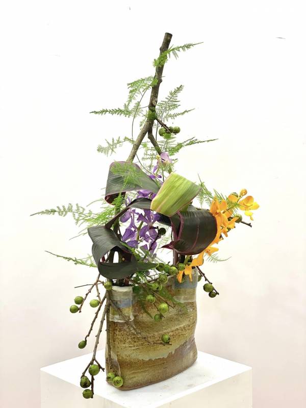 | 基本立真型盛花:逆勝手花型 | 插花作品在許多時候因為擺放環境及空間的種種原因,會需要有逆勝手花型,學員要多加練習。 |