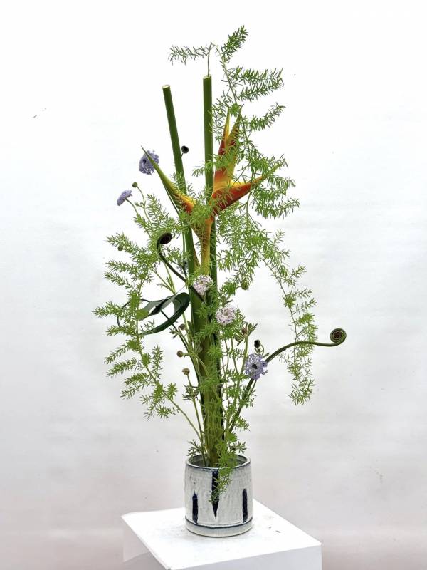 | 基本傾真型盛花:傾斜美感 | 顧名思義傾真花型,真枝是相對傾斜的,較為直挺的副枝在其後略短,控枝則與立真花型相同,此基本花型強調素材斜出的美感,構圖上相對寬廣,帶引視覺對於水際的關注更是東方不對稱平衡美學之代表。 |