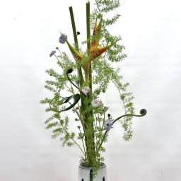 | 立真基本型盛花:複習 | 控枝插在右側傾斜75度,微略前倒通常使用賦予色彩的草本花卉,選材原則搭配主枝素材或季節感。插作時注意花朵的面向(向上與向前為佳) |